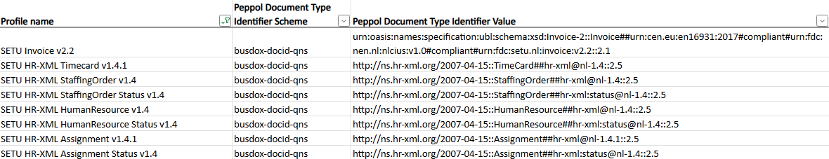 To enable this, specific Document Type Identifiers are registered within the Peppol network for the various SETU message types. These identifiers are crucial for the identification and processing of the messages within the network. They ensure that the receiving system recognizes the type of SETU message and can process its content accordingly. The image below provides an example overview of the Document Type Identifiers assigned to SETU messages. For the complete, authoritative list, please refer to the official Peppol Codelists page mentioned below.