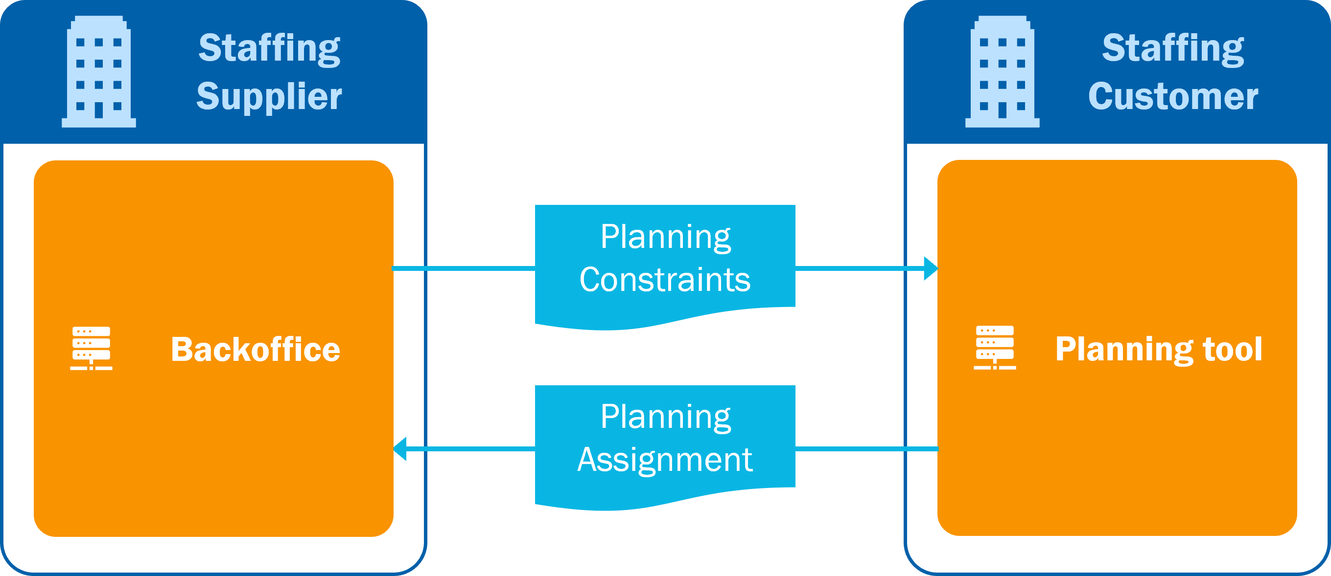 In the second scenario, the staffing customer is responsible for the planning. The staffing customer receives PlanningConstraints about the human resource (e.g, availability) and other human resource data of the staffing supplier. Then, the staffing customer creates a schedule that includes the flexible workers. This schedule (PlanningAssignment) is communicated back to the staffing supplier. The staffing supplier can provide updates on constraints and availabilities (e.g. due to illness or leave), as a consequence the staffing customer creates a new schedule and sends it back to the staffing supplier. This scenario is most likely when a flexible worker works exclusively for the client.